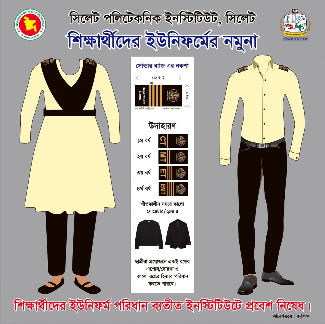 ছাত্রদের জন্য : অফ হোয়াইট রংয়ের শার্ট, কালো প্যান্ট, কালো সু, অফ হোয়াইট পাঞ্জাবী, কোমরের কালো রঙের বেল্ট।